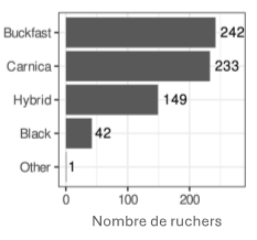 Nombre de ruchers par type de races d’abeilles mellifères utilisées par les apiculteurs ayant répondu à l’enquête européenne COLOSS en 2024 en Belgique © Enquête COLOSS Belgique 2023-20224